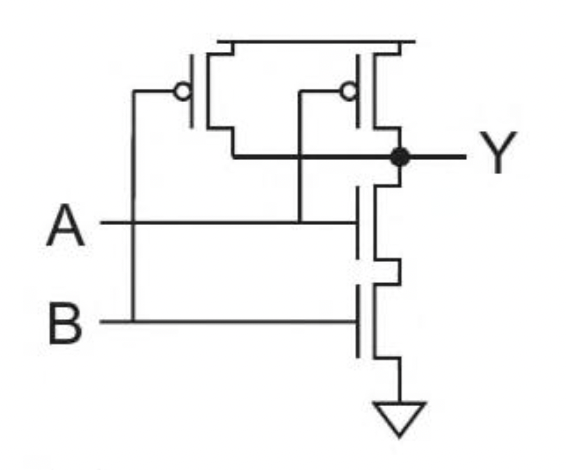 If either input A or input B (or both) is "low" (0), the following occurs: At least one of the PFETs in the parallel pull-up network will turn on, creating a path from the output to the high voltage supply (Vdd). At least one of the NFETs in the series pull-down network will be off, breaking the path to ground. As a result, the output is pulled "high" (1).